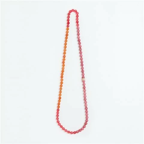 - Threaded with faceted agate gemstones of various tones including rose, camelia pink and tangerine.