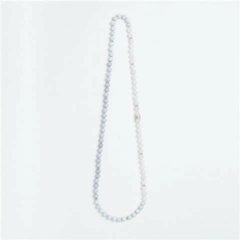- Threaded with faceted agate gemstones of various tones including light blue, powder blue and soft white.