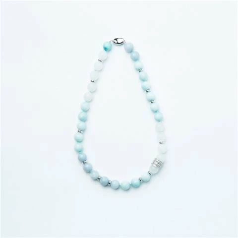- Threaded with faceted agate gemstones of various tones including light blue, powder blue and soft white.