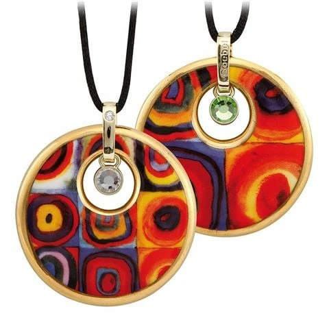 This hand-painted porcelain necklace with gilded edges and a yellow Swarovski crystal, really is a work of art. It’s based on Russian painter, Wassily Kandinski’s work, Colour Study and the pendant is decorated on both sides.