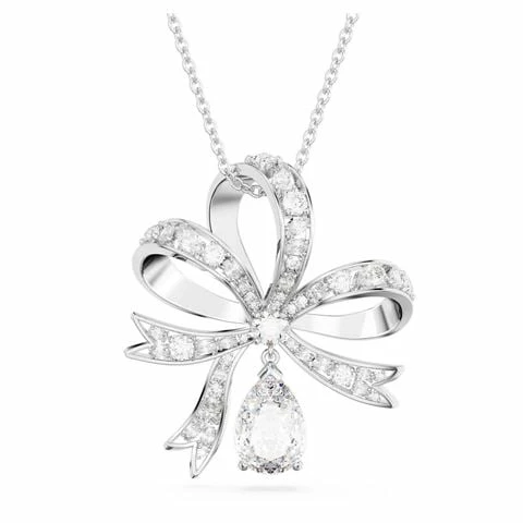 The Volta Pendant is nothing short of dazzling. The pendant is rhodium plated in a bow-like design, adorned with clear crystals that are set in place using the chattonage technique. Two delicate stones also add to the effect, with a round stone at the centre of the bow, and a separate pear-shaped embellishment which hangs beneath. Pair with other pieces from the collection for a truly enchanting look.