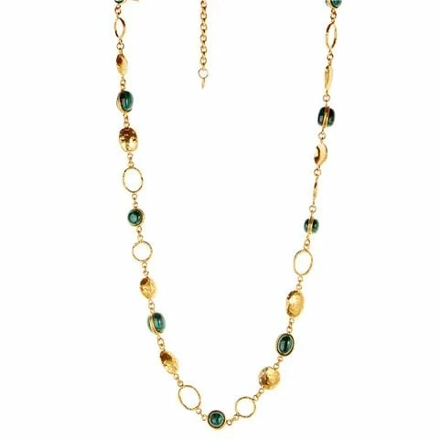 Join an exotic gypsy tribe with Sylvia Toledano’s Lee Malachite Necklace with vibrant green stones to add a mystique to the textured chain links. It’s fashioned with luxe materials of 22 karat gold plated brass. Wear it like a true gypsy with several more necklaces at once.